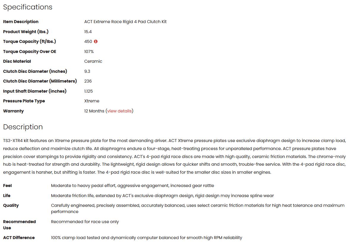 TS3-XTR4 kit features an Xtreme pressure plate for the most demanding driver. ACT Xtreme pressure plates use exclusive diaphragm design to increase clamp load, reduce deflection and maximize clutch life. All diaphragms endure a four-stage, heat-treating process for unparalleled performance. ACT pressure plates have precision cover stampings to provide rigidity and consistency. ACT's 4-pad rigid race discs are made with high quality, ceramic friction materials. The chrome-moly hub is heat-treated for strength and durability. The lightweight, rigid design allows for quicker shifts and smooth, trouble-free service. With the 4-pad rigid race disc, engagement is harsher, but shifting is faster. The 4-pad rigid race disc is well-suited for the smaller disc sizes in smaller engines.