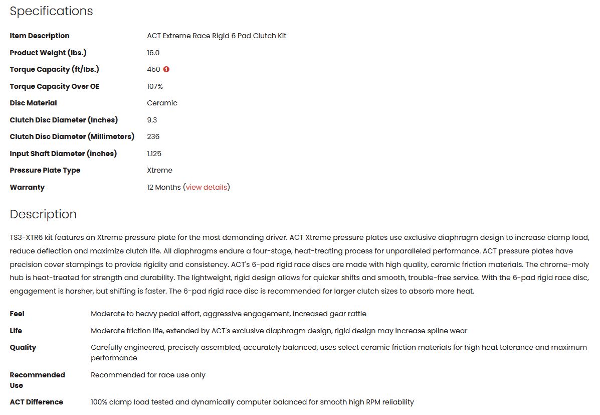 TS3-XTR6 kit features an Xtreme pressure plate for the most demanding driver. ACT Xtreme pressure plates use exclusive diaphragm design to increase clamp load, reduce deflection and maximize clutch life. All diaphragms endure a four-stage, heat-treating process for unparalleled performance. ACT pressure plates have precision cover stampings to provide rigidity and consistency. ACT's 6-pad rigid race discs are made with high quality, ceramic friction materials. The chrome-moly hub is heat-treated for strength and durability. The lightweight, rigid design allows for quicker shifts and smooth, trouble-free service. With the 6-pad rigid race disc, engagement is harsher, but shifting is faster. The 6-pad rigid race disc is recommended for larger clutch sizes to absorb more heat.