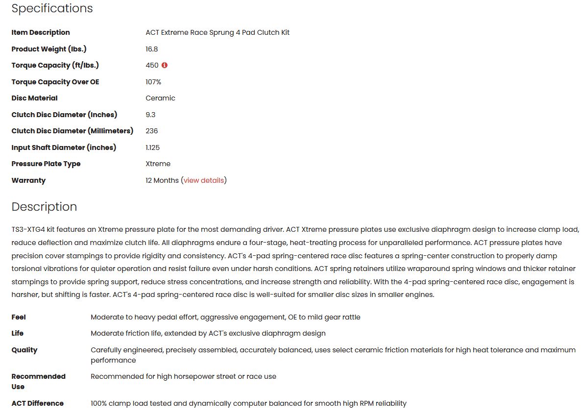 TS3-XTG4 kit features an Xtreme pressure plate for the most demanding driver. ACT Xtreme pressure plates use exclusive diaphragm design to increase clamp load, reduce deflection and maximize clutch life. All diaphragms endure a four-stage, heat-treating process for unparalleled performance. ACT pressure plates have precision cover stampings to provide rigidity and consistency. ACT's 4-pad spring-centered race disc features a spring-center construction to properly damp torsional vibrations for quieter operation and resist failure even under harsh conditions. ACT spring retainers utilize wraparound spring windows and thicker retainer stampings to provide spring support, reduce stress concentrations, and increase strength and reliability. With the 4-pad spring-centered race disc, engagement is harsher, but shifting is faster. ACT's 4-pad spring-centered race disc is well-suited for smaller disc sizes in smaller engines.