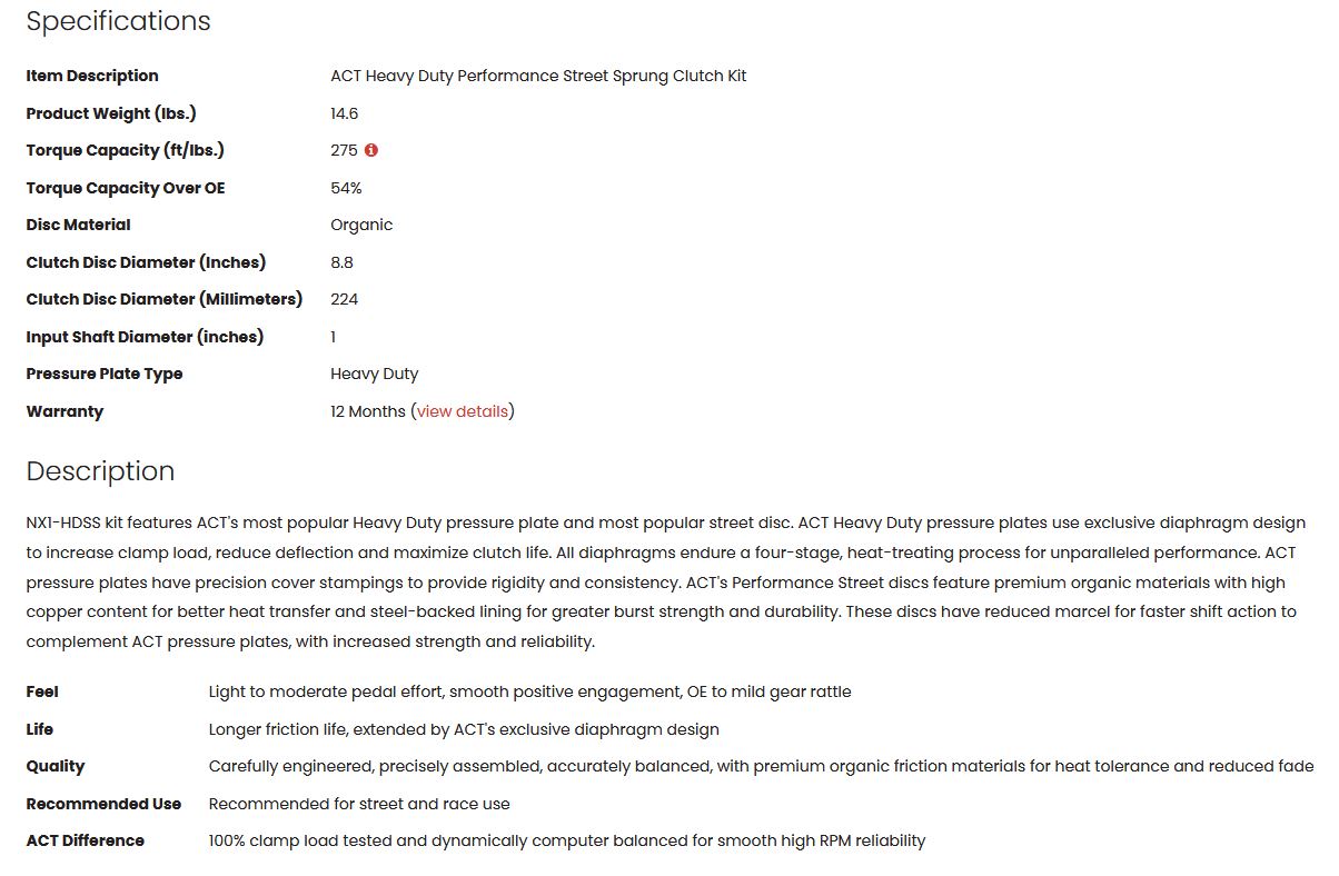 NX1-HDSS kit features ACT's most popular Heavy Duty pressure plate and most popular street disc. ACT Heavy Duty pressure plates use exclusive diaphragm design to increase clamp load, reduce deflection and maximize clutch life. All diaphragms endure a four-stage, heat-treating process for unparalleled performance. ACT pressure plates have precision cover stampings to provide rigidity and consistency. ACT's Performance Street discs feature premium organic materials with high copper content for better heat transfer and steel-backed lining for greater burst strength and durability. These discs have reduced marcel for faster shift action to complement ACT pressure plates, with increased strength and reliability.