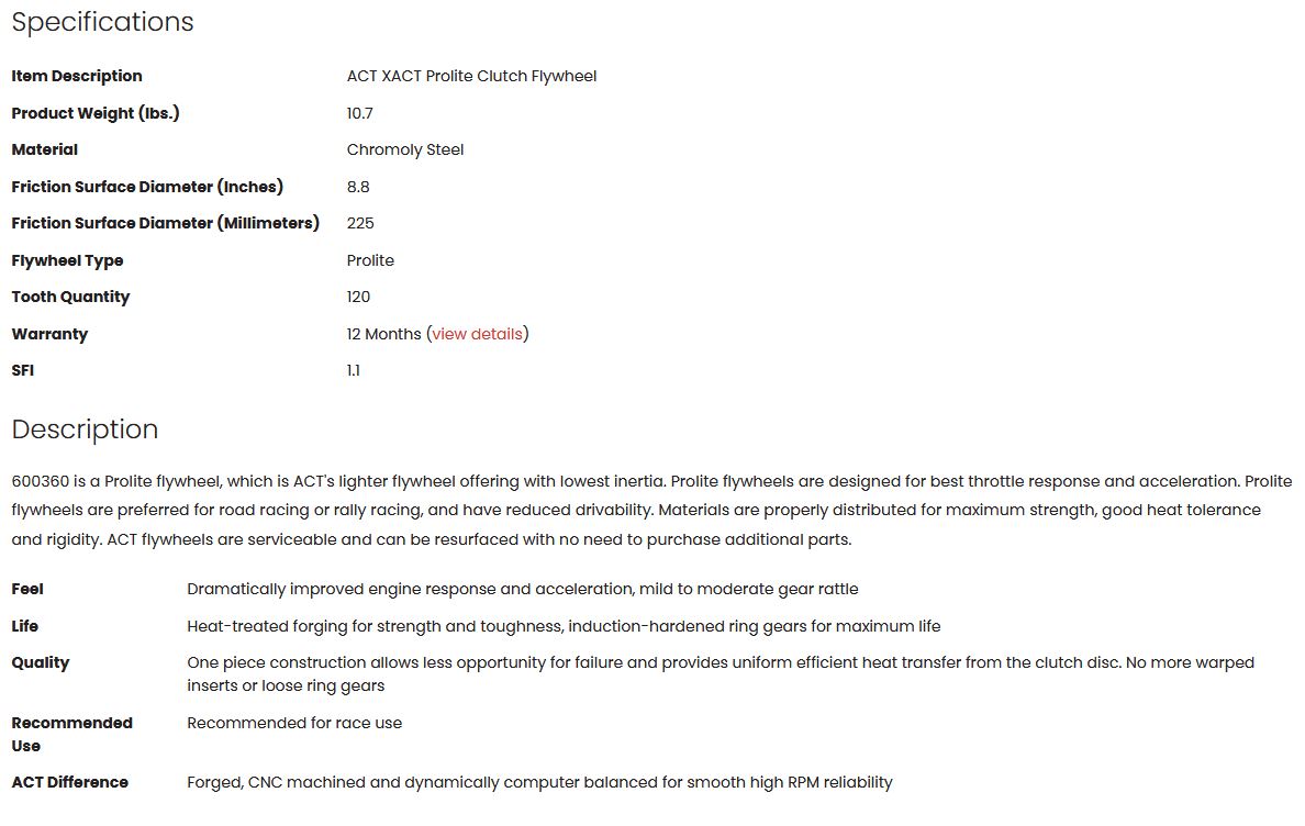 Dramatically improved engine response and acceleration, mild to moderate gear rattle; Heat-treated forging for strength and toughness, induction-hardened ring gears for maximum life; One piece construction allows less opportunity for failure and provides uniform efficient heat transfer from the clutch disc. No more warped inserts or loose ring gears; Recommended for race use; Forged, CNC machined and dynamically computer balanced for smooth high RPM reliability