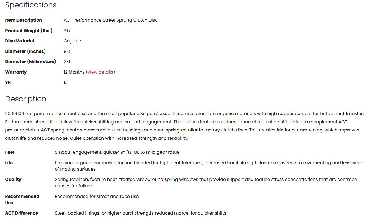 3000604 is a performance street disc and the most popular disc purchased. It features premium organic materials with high copper content for better heat transfer. Performance street discs allow for quicker shifting and smooth engagement. These discs feature a reduced marcel for faster shift action to complement ACT pressure plates. ACT spring-centered assemblies use bushings and cone springs similar to factory clutch discs. This creates frictional dampening, which improves clutch life and reduces noise. Quiet operation with increased strength and reliability.