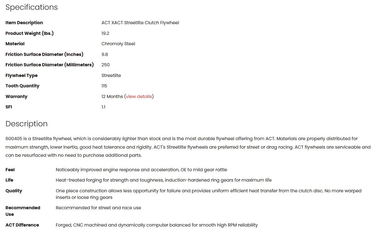 Noticeably improved engine response and acceleration, OE to mild gear rattle; Heat-treated forging for strength and toughness, induction-hardened ring gears for maximum life; One piece construction allows less opportunity for failure and provides uniform efficient heat transfer from the clutch disc. No more warped inserts or loose ring gears; Recommended for street and race use; Forged, CNC machined and dynamically computer balanced for smooth high RPM reliability