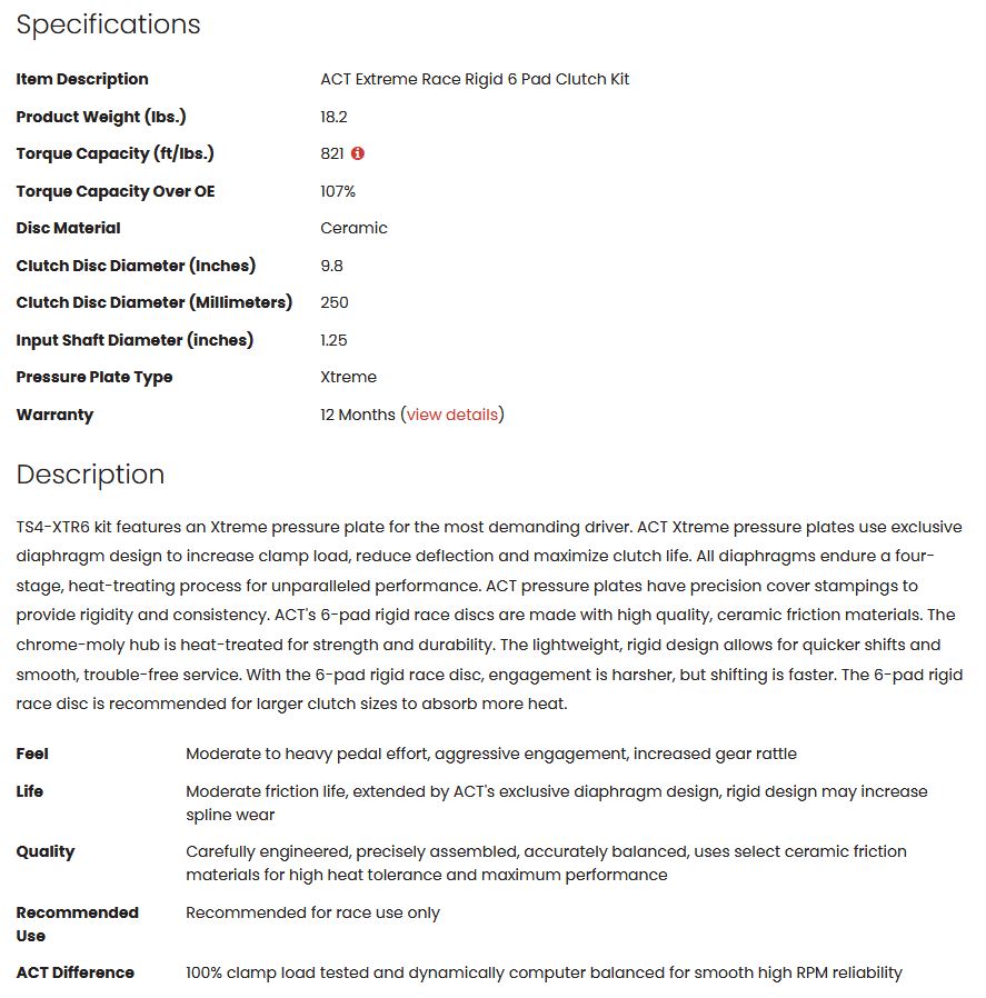 TS4-XTR6 kit features an Xtreme pressure plate for the most demanding driver. ACT Xtreme pressure plates use exclusive diaphragm design to increase clamp load, reduce deflection and maximize clutch life. All diaphragms endure a four-stage, heat-treating process for unparalleled performance. ACT pressure plates have precision cover stampings to provide rigidity and consistency. ACT's 6-pad rigid race discs are made with high quality, ceramic friction materials. The chrome-moly hub is heat-treated for strength and durability. The lightweight, rigid design allows for quicker shifts and smooth, trouble-free service. With the 6-pad rigid race disc, engagement is harsher, but shifting is faster. The 6-pad rigid race disc is recommended for larger clutch sizes to absorb more heat.