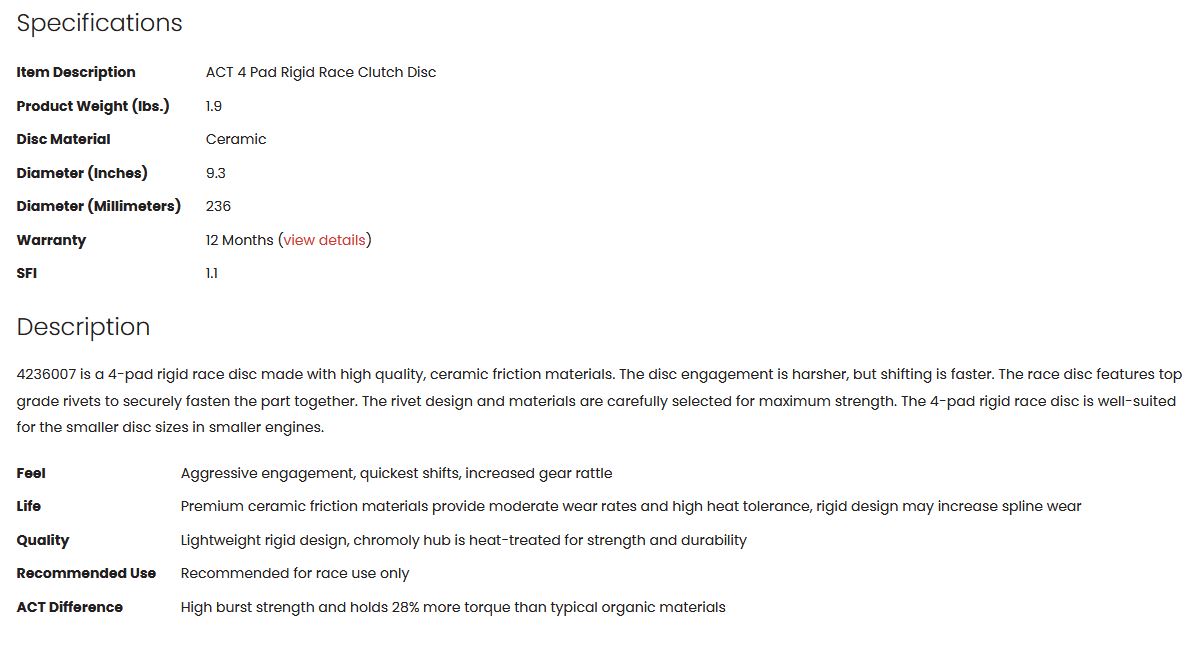 4236007 is a 4-pad rigid race disc made with high quality, ceramic friction materials. The disc engagement is harsher, but shifting is faster. The race disc features top grade rivets to securely fasten the part together. The rivet design and materials are carefully selected for maximum strength. The 4-pad rigid race disc is well-suited for the smaller disc sizes in smaller engines.
