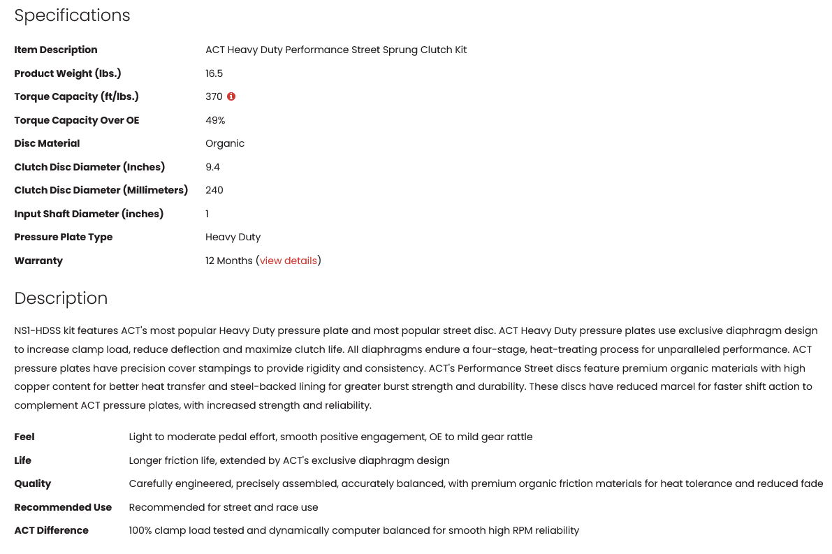 NS1-HDSS kit features ACT's most popular Heavy Duty pressure plate and most popular street disc. ACT Heavy Duty pressure plates use exclusive diaphragm design to increase clamp load, reduce deflection and maximize clutch life. All diaphragms endure a four-stage, heat-treating process for unparalleled performance. ACT pressure plates have precision cover stampings to provide rigidity and consistency. ACT's Performance Street discs feature premium organic materials with high copper content for better heat transfer and steel-backed lining for greater burst strength and durability. These discs have reduced marcel for faster shift action to complement ACT pressure plates, with increased strength and reliability.