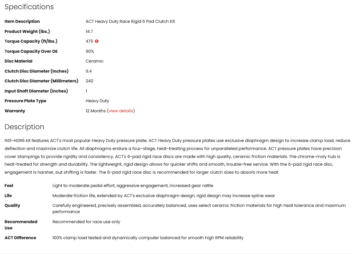 NS1-HDR6 kit features ACT's most popular Heavy Duty pressure plate. ACT Heavy Duty pressure plates use exclusive diaphragm design to increase clamp load, reduce deflection and maximize clutch life. All diaphragms endure a four-stage, heat-treating process for unparalleled performance. ACT pressure plates have precision cover stampings to provide rigidity and consistency. ACT's 6-pad rigid race discs are made with high quality, ceramic friction materials. The chrome-moly hub is heat-treated for strength and durability. The lightweight, rigid design allows for quicker shifts and smooth, trouble-free service. With the 6-pad rigid race disc, engagement is harsher, but shifting is faster. The 6-pad rigid race disc is recommended for larger clutch sizes to absorb more heat.