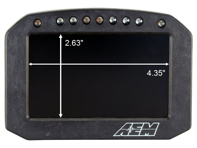 AEM CD5 Carbon Flat Panel Digital Displays are perfect for flush mount installation or in-dash enclosures with tight tolerances. They include all of the robust features found in the original CD-5 Carbon car dashboard monitors, but do not have buttons or an LED shade hood built into the enclosure. AEM CD5 Carbon Flat Panel Digital Displays feature full-color, daylight readable screens surrounded by a slim, tough, lightweight flow-molded carbon fiber composite housing. Seven ultra-bright LEDs span the top of the display housings for RPM and shift light indication. Users can program them to ascend in specific increments based on RPM range and flash when it is time to shift. Brightness is user programmable on the fixed color LEDs. A remote button kit (PN 30-3610, sold separately) easily wires into the CD Carbon wiring harness and allows users to change pages and clear memory. Two additional programmable LEDs are included in the car dashboard monitor's enclosure and are fully programmable