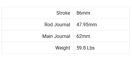 4340 billet w/Honda Journal. All cranks are stress relieved, shot peened, magna flux inspected and nitrided (multi step heat treatment) for ultimate performance. Fully profiled counterweights are designed for reduced windage through the crankcase creating less oil resistance for better rpm potential.