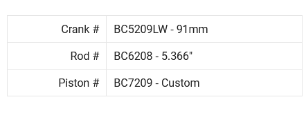 2.35L - Includes 4340 LightWeight billet crank, 91mm stroke, ProH625+ rods (5.366 c-to-c), and custom pistons (choice of bore/compression). ACL Race bearings available separately.