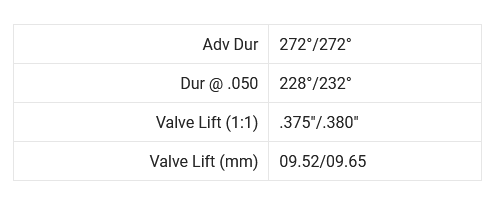 Longer duration profile, added rpm potential. Intended for fully built engine. Tuning and ECU mods recommended. Requires kit BC0300.