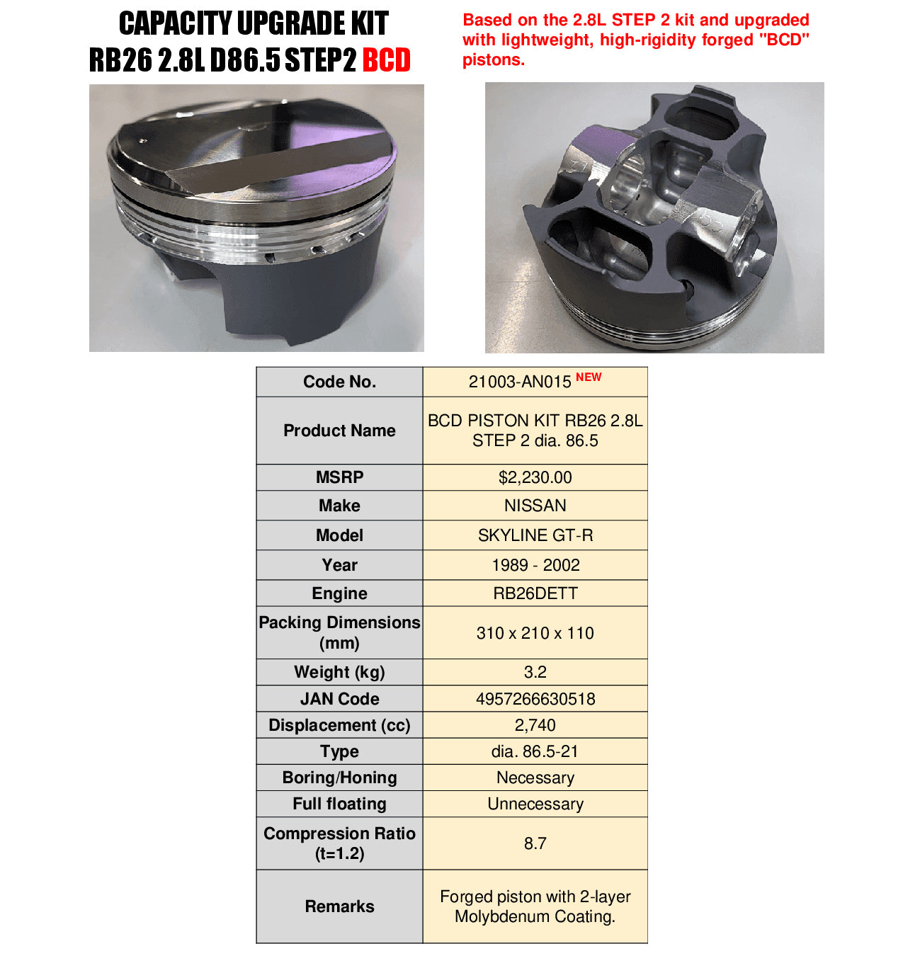 HKS BCD Piston Kit RB26 2.8L 86.5