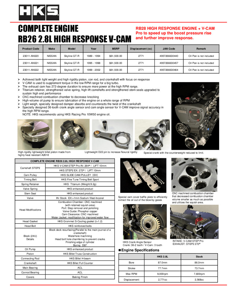 HKS Complete RB26 Engine 2.8L HR High Response V-CAM - Nissan GTR R34
