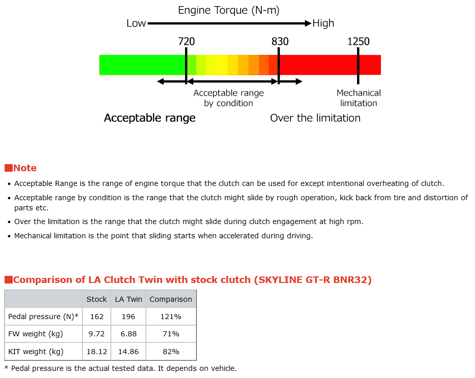"LA CLUTCH TWIN", which is twin plate clutch with the concept of LA CLUTCH, has been released for BCNR33, BNR32 (Late model) and ER34. Maximum torque 73kgf-m, horsepower 700ps. With big capacity as metal clutches, easy clutch operation as stock. High total balance clutch system.