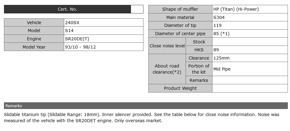 Slidable titanium tip (Slidable Range: 18mm). Inner silencer provided. See the table below for close noise information. Noise was measured of the vehicle with the SR20DET engine. Only overseas market.