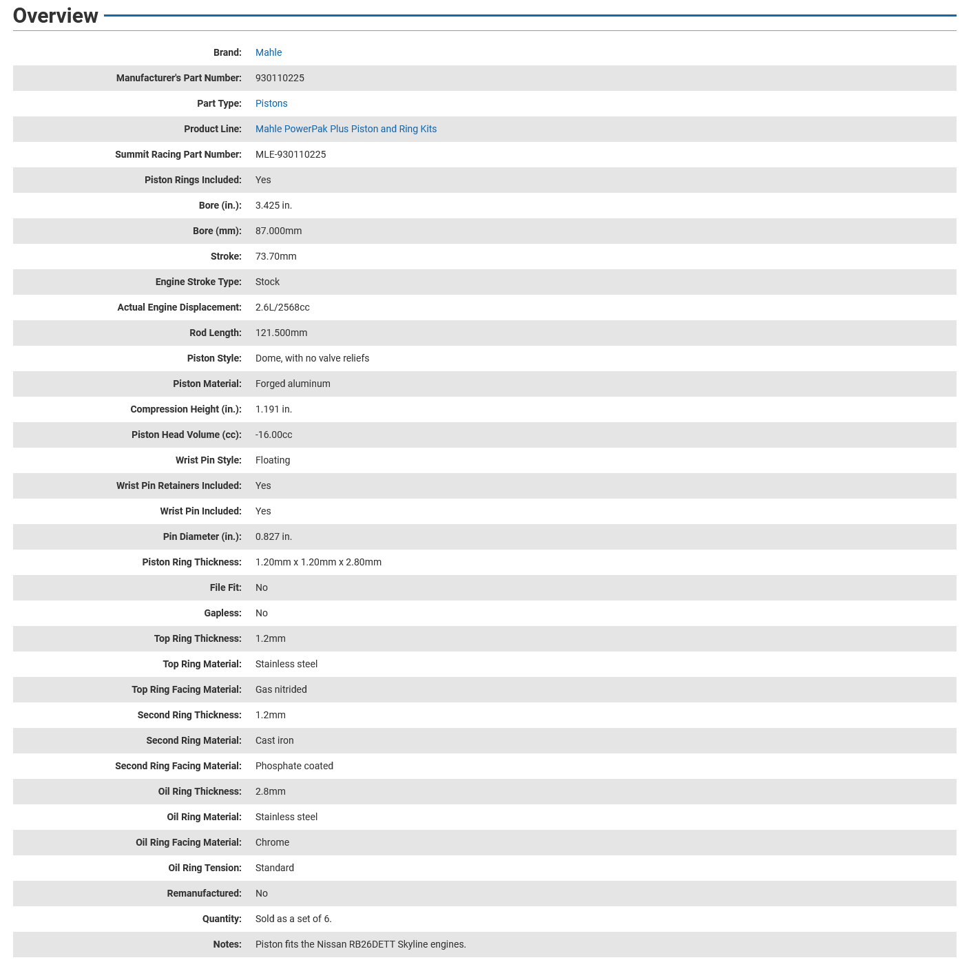 Mahle PowerPak Forged Piston Set/6 - RB26DETT 87.00mm Bore 73.7mm Stroke 121.5mm Rod 21mm Pin 16cc 8.5 CR