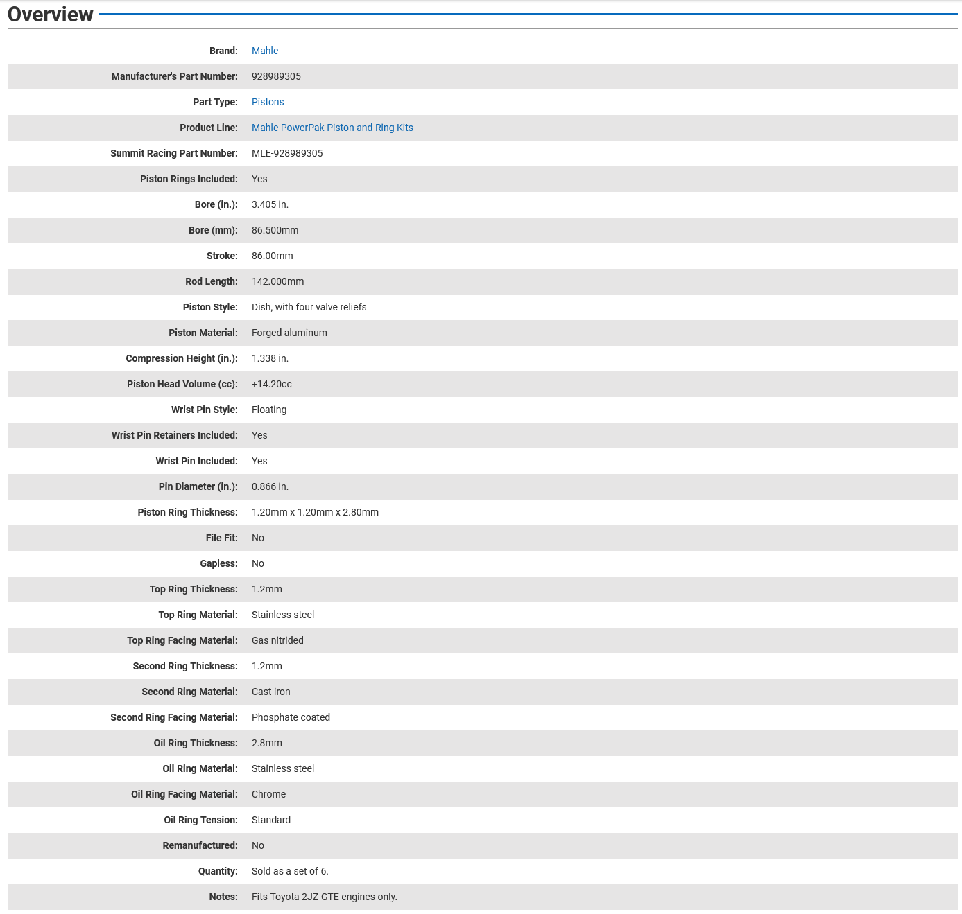 TOYOTA 2JZ-GTE (SUPRA) 3.0L 86.50mm x 34.0mm CH, 86.0mm stroke,142.0mm rod,22mm pin,-14.2cc,337g,8.6CR, 2618.