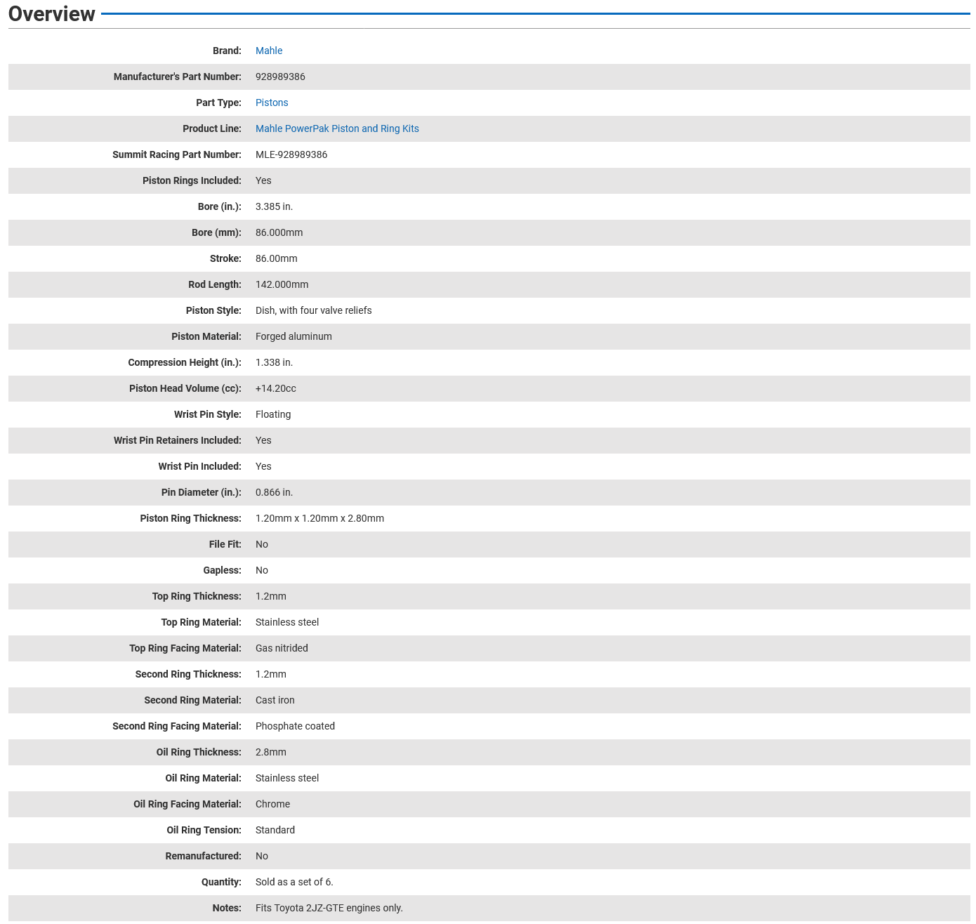 Mahle PowerPak Forged Piston Set/6 - 2JZ GTE - 86mm Bore 86mm Stroke 142mm Rod 22mm Pin 14.2cc 8.6 CR