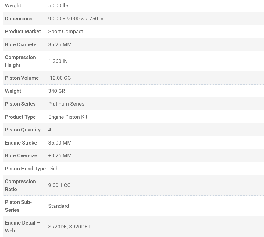 Manley Platinum Series Piston Set SR20DET / SR20DE 86.25mm Bore 1.260in CH -12.00 CC