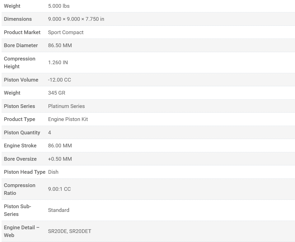 Manley Platinum Series Piston Set SR20DET / SR20DE 86.50mm Bore 1.260in CH -12.00 CC