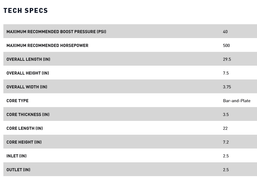 - Intercooler design optimized for maximum flow, and smooth cast end tanks allow the best possible airflow in and out of the intercooler