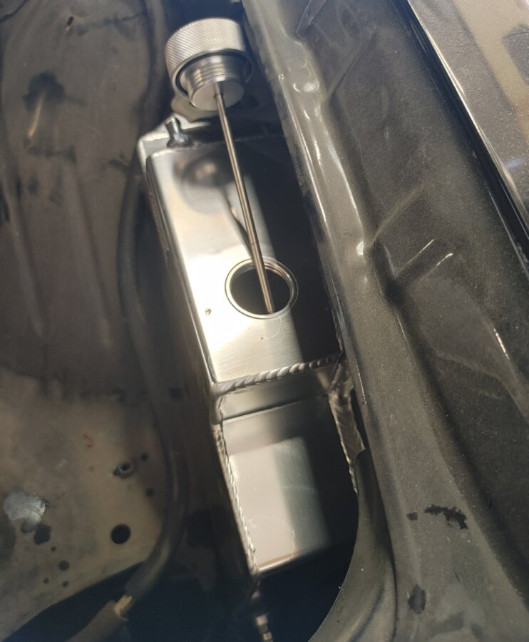 - Improved aluminum threaded screw on cap with integrate dip stick viewing tube