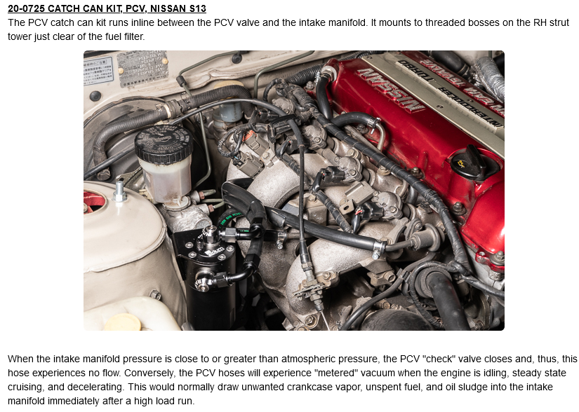 Single catch can kit for the Nissan S13. Interfaces with the PCV line. Includes all parts necessary for a complete installation.