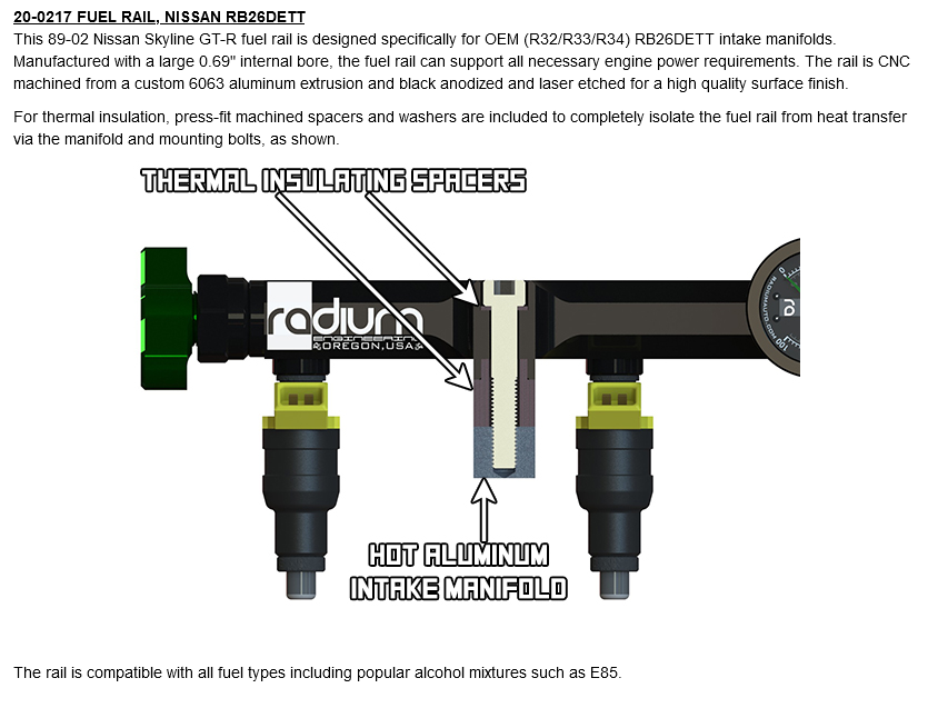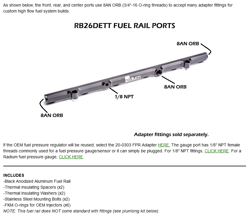 This fuel rail is compatible with factory or OEM equivalent fuel injectors. If upgrading fuel injectors, consult your aftermarket injector supplier for details. Radium Engineering cannot specify any further injector dimensions other than stating ‘OEM equivalent’.