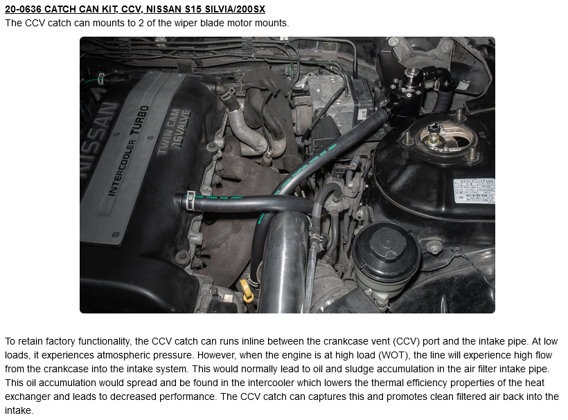 Single catch can kit for the S15 Nissan Silvia/200sx (RHD) SR20DET. Interfaces with the crankcase vent line. Includes all parts needed for an easy bolt-in installation.  Includes Radium's Fluid Lock catch can (patent pending).