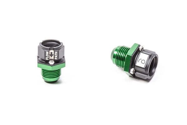 Universal in-line check valve. Female 8AN ORB inlet, male 10AN flare outlet. Compatible with all fluids.