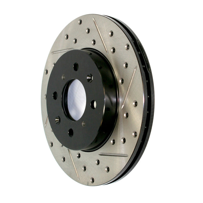 StopTech Drilled and Slotted Sport Rotors are 1-piece direct replacement brake discs for factory brake systems and stock calipers that look great behind your wheels – and offer significantly improved braking performance. The unique cross-drilling and slotting aids with heat and brake dust dispersal, prevents glazing of the pads, adds bite and improves wet and dry braking performance. Built to last, the black e-coating provides protection from corrosion and the high carbon metallurgy (in most applications) offers quieter operation, better crack resistance and increased performance.