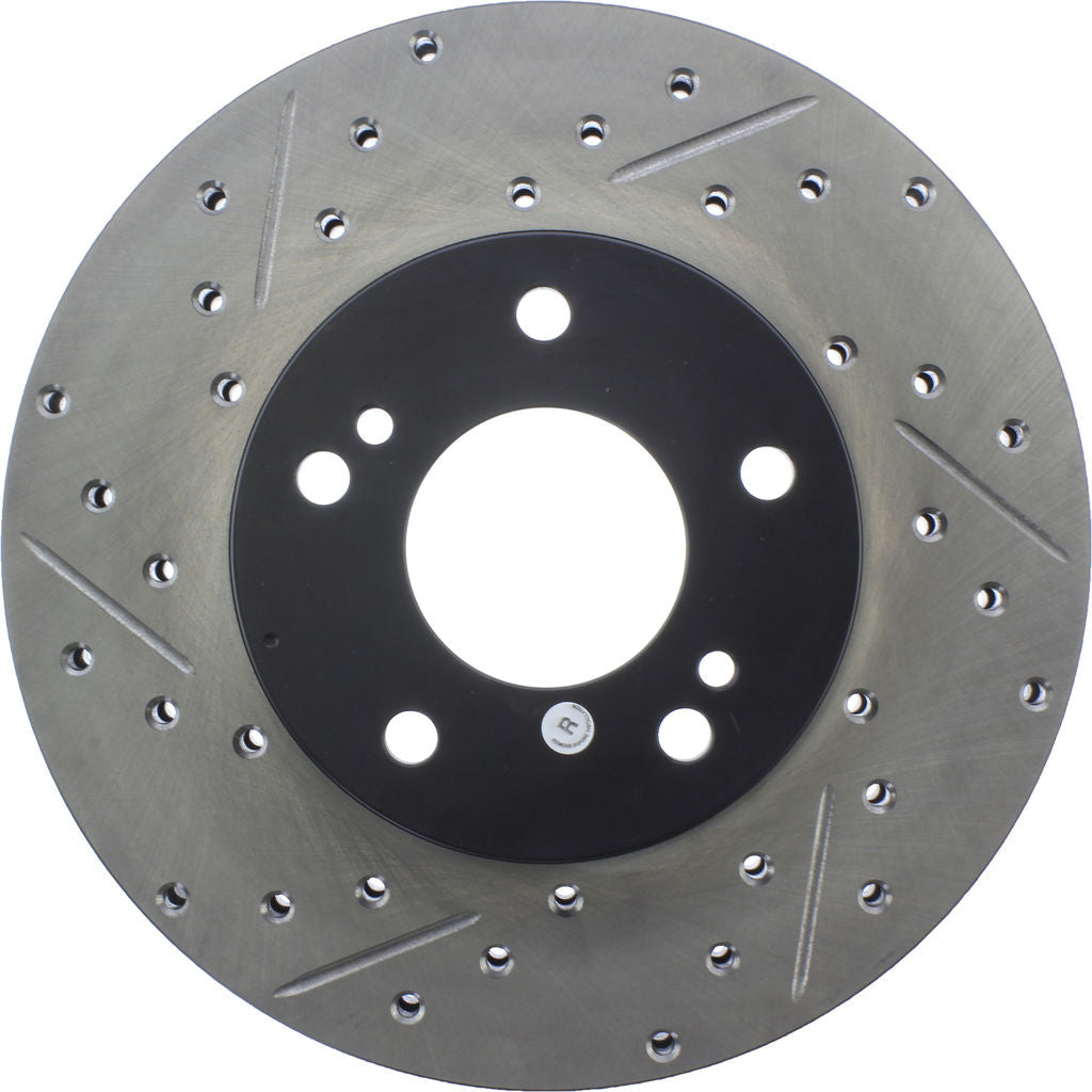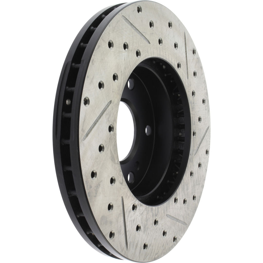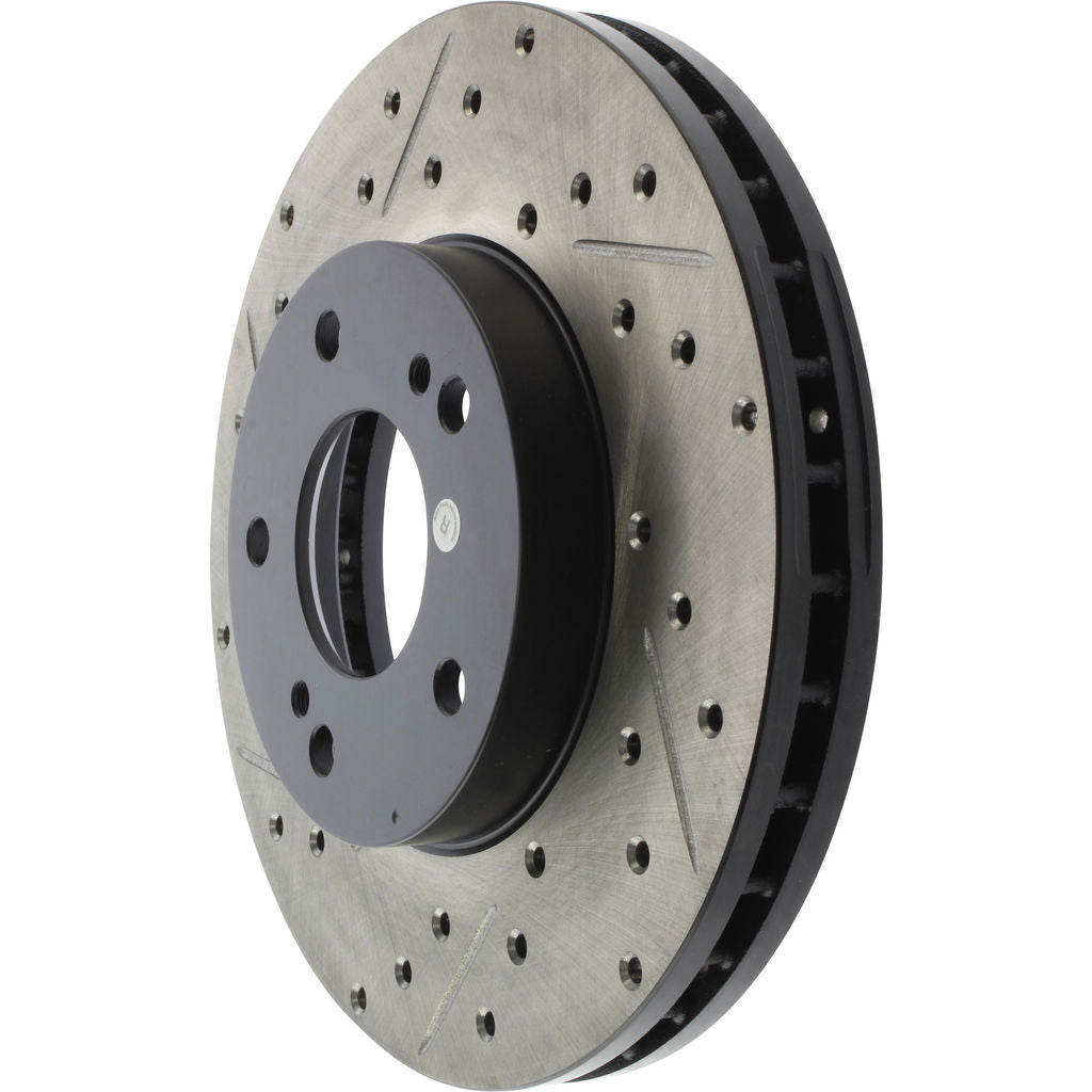 StopTech Drilled and Slotted Sport Rotors are 1-piece direct replacement brake discs for factory brake systems and stock calipers that look great behind your wheels – and offer significantly improved braking performance. The unique cross-drilling and slotting aids with heat and brake dust dispersal, prevents glazing of the pads, adds bite and improves wet and dry braking performance. Built to last, the black e-coating provides protection from corrosion and the high carbon metallurgy (in most applications) offers quieter operation, better crack resistance and increased performance.